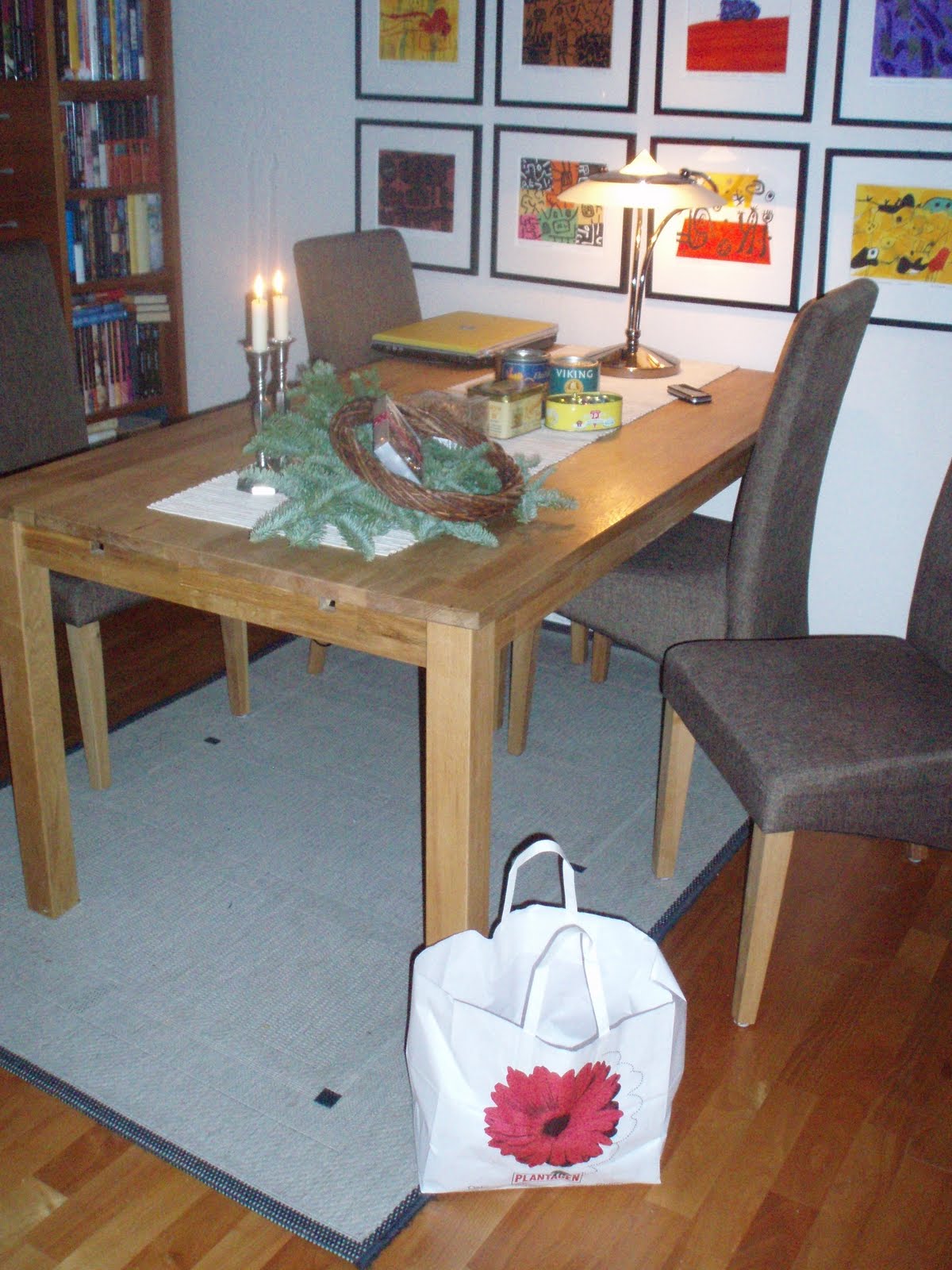 Oki...I`m back etter en liten bloggepause. Det har vært mye aktivitet den siste uken,pluss at Mannen har okkupert pcen dagen lang ( han er nemlig ansvarlig for å redigere tidsskriftet til fagforeningen som han er nestleder i) Men nå er bladet ferdig og levert til trykkings, så nå er pcen atter til min disposisjon! I dag har jeg og lillegull vært en tur på plantasjen for å kjøpe ting for å lage en krans. Planen er å ta ned noen av bildene i stua og erstatte de med advent/ etterhvert julekrans og også julekalender til meg, Mannen og lillegull.